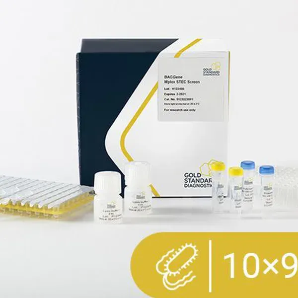 The BACGene Mplex STEC screen real-time PCR detection kit provides materials for a rapid and reliable detection of shigatoxins encoded for by the stx1 and stx2 genes and another genetic marker eae, which encodes for the adhesion factor Intimin, is known to enhance the virulence of STEC. It can be used as a screening step in the Top7 workflow or a confirmation following a positive PCR result for O157. Detects DNA in several food products and environmental samples from food production facilities. The kit is intended to be used in analytical laboratories and may also be applied for other purposes in food product research and analysis fields, e.g. microbial monitoring of production processes.